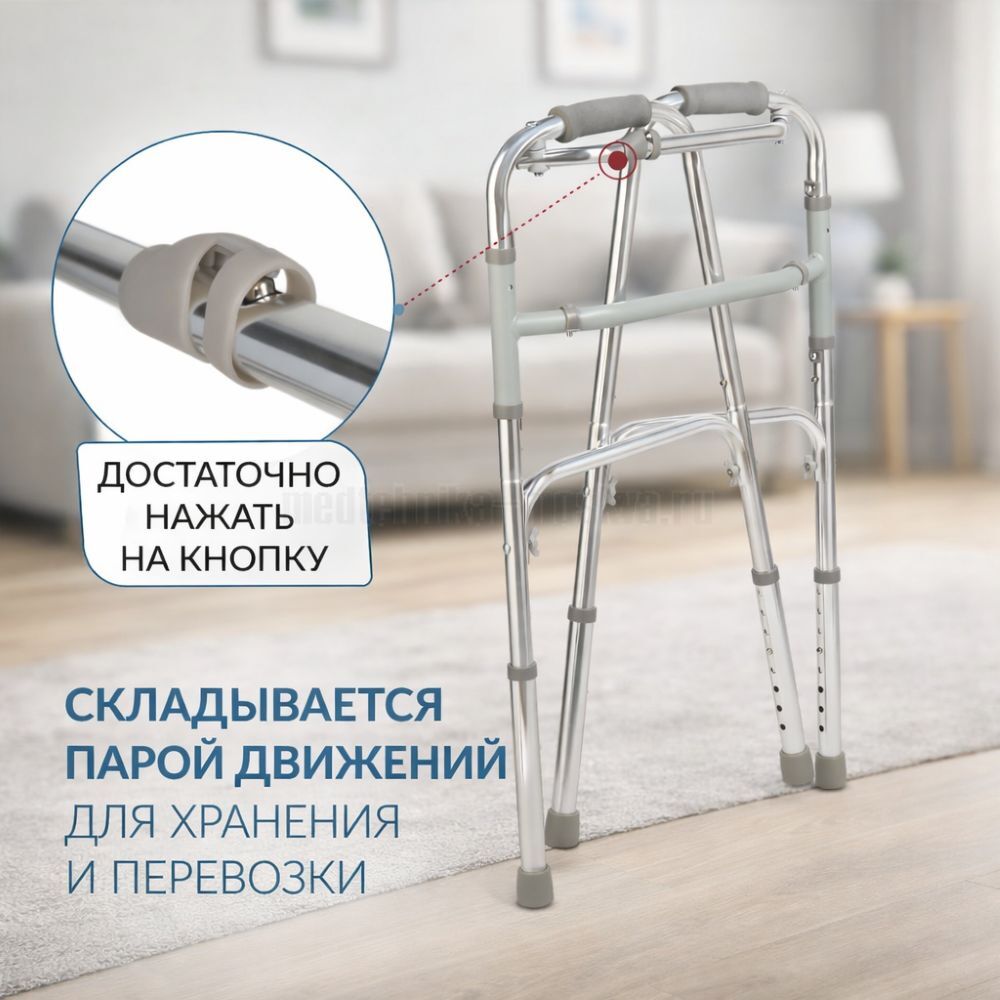 - Ходунки оснащены интуитивно понятным механизмом, позволяющим быстро сложить их в компактное положение;