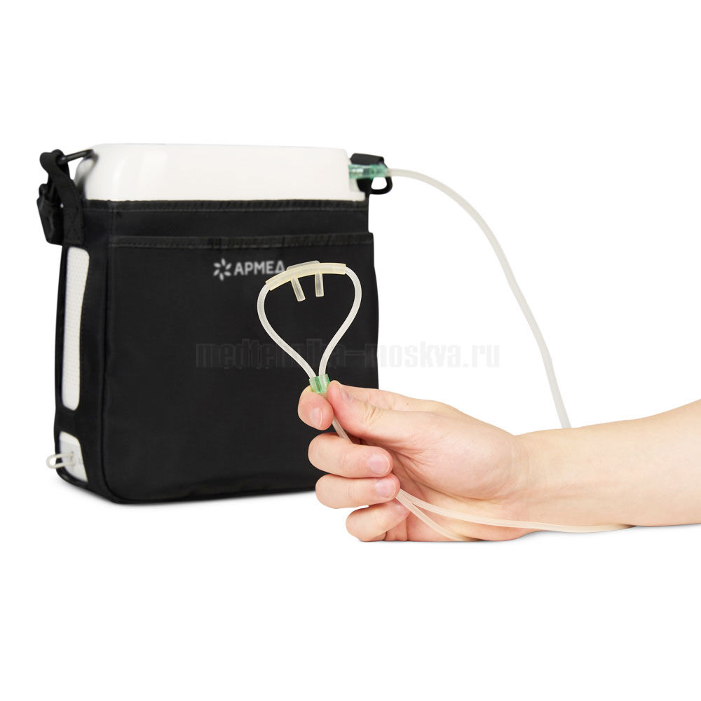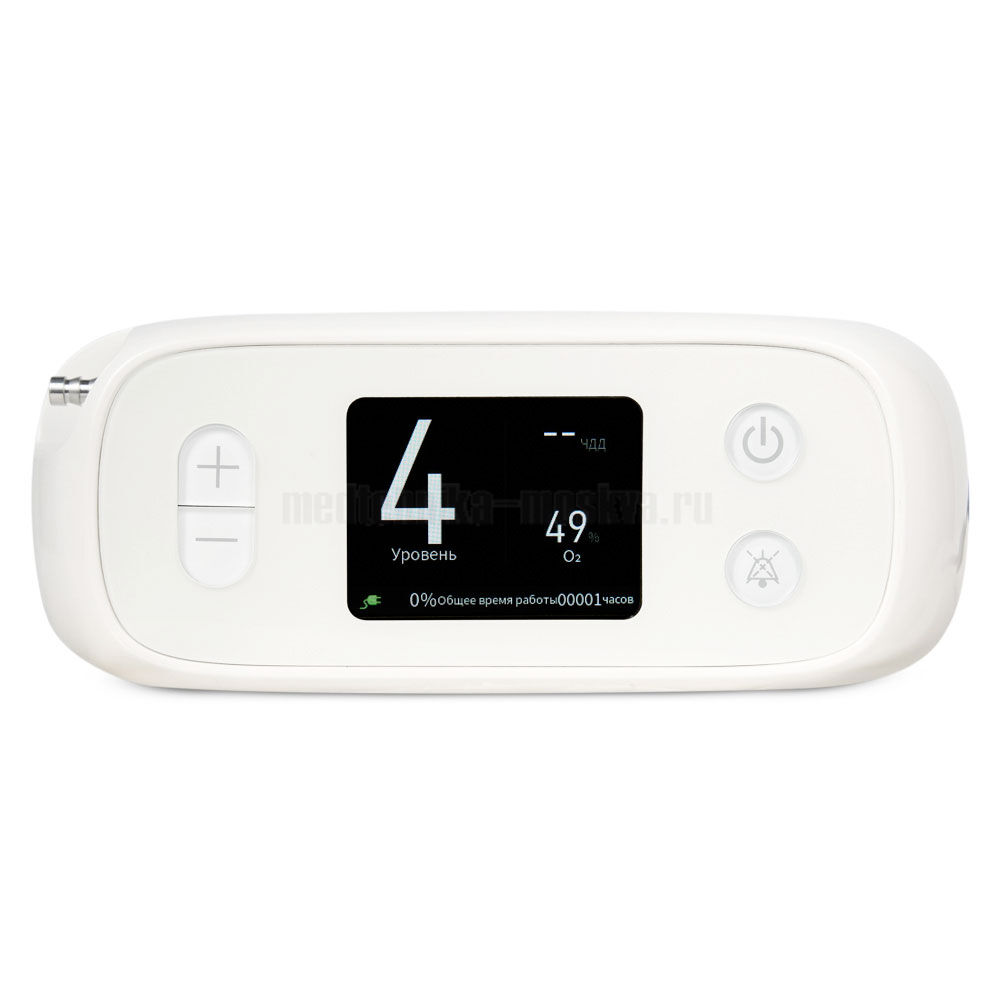 Прибор для проведения оксигенотерапии людям с заболеваниями сердечно-сосудистой и дыхательной систем. Может применяться в поездках, прост в транспортировке, оснащен аккумуляторной батареей, за счет этого независим от сетевого электропитания. Уровень потока меняется в зависимости от частоты дыхания пациента.