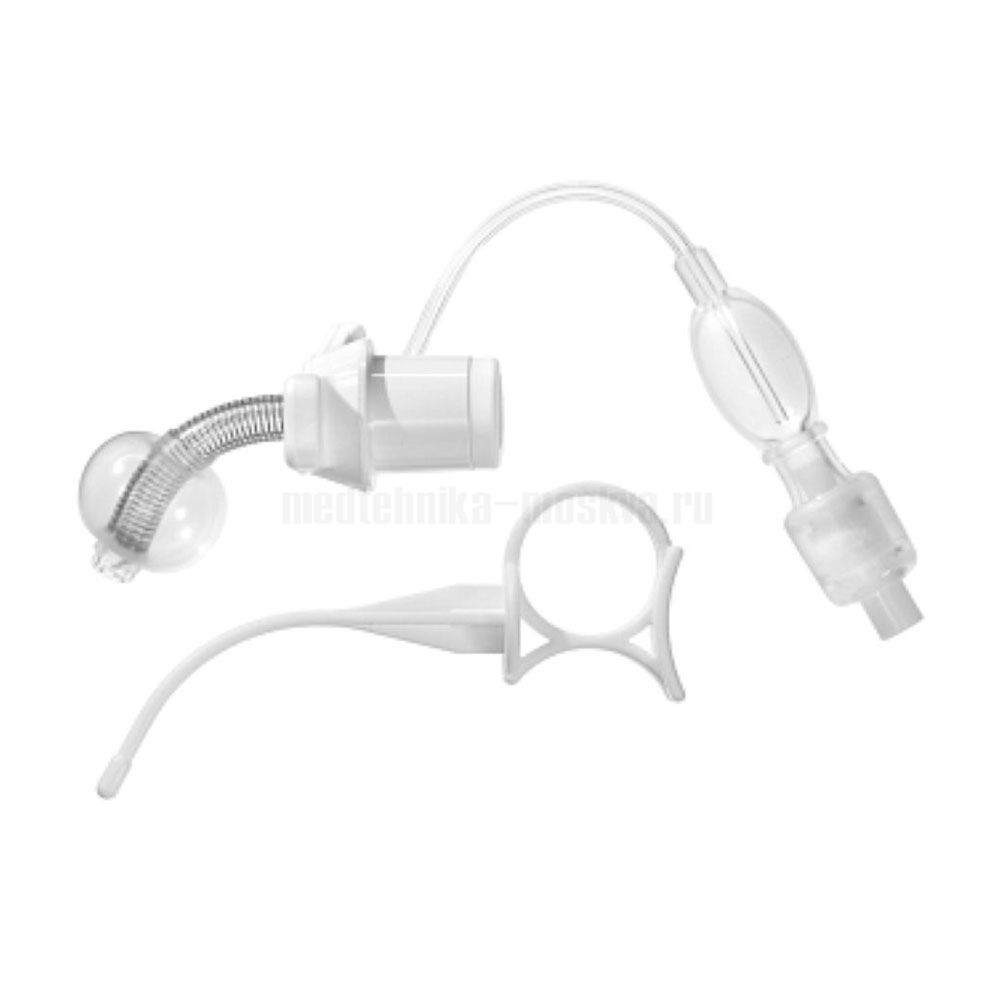Трахеостомическая трубка для новорождённых и детей грудного возраста оснащена водяной манжетой H₂O и спиральным армированием, обеспечивающим устойчивость формы и защиту от перегибов. Изделие изготовлено из мягкого медицинского силикона высокого качества, хорошо адаптирующегося к анатомическим особенностям пациента. Манжета заполняется стерильной водой и в ненадутом состоянии плотно прилегает к канюле, не образуя складок. Трубка поставляется в индивидуальной стерильной упаковке.